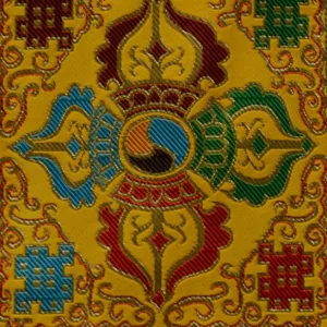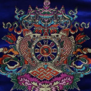 - This ornate altar mat cleverly incorporates a handful of Tibetan auspicious symbols.
