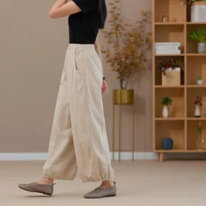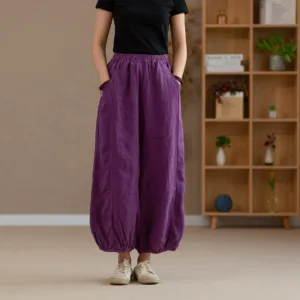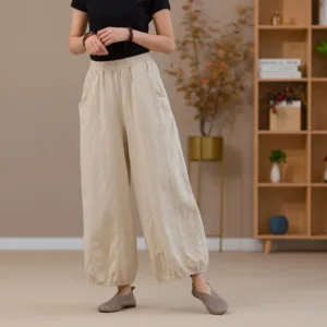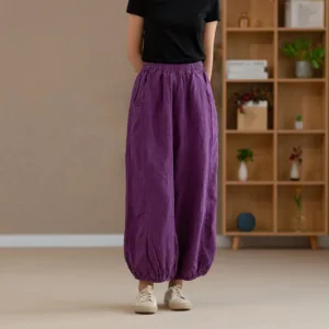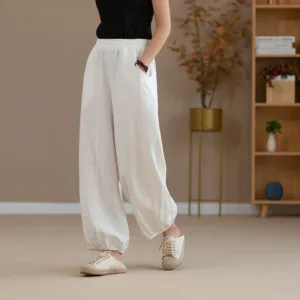 Ramie Linen Yoga pants feature a flexible waistband and practical pockets. designed for comfort and convenience during yoga or casual wear. Made from breathable ramie linen. these harem pants offer a loose fit that allows unrestricted movement and optimal airflow. The natural fabric ensures durability and comfort. making them a perfect choice for those who value functionality and ease in their active wear.