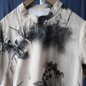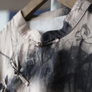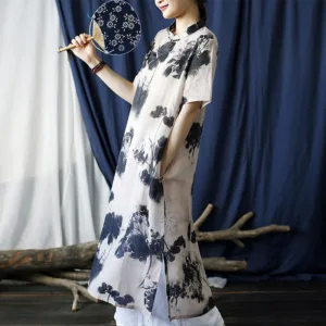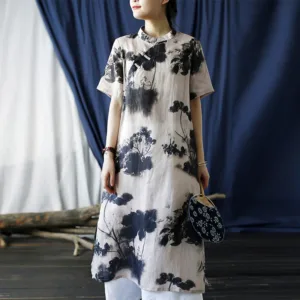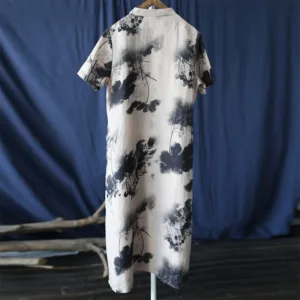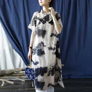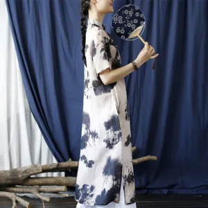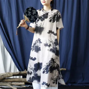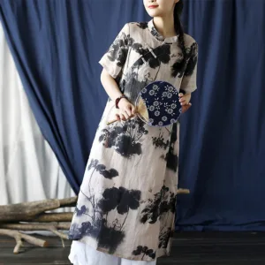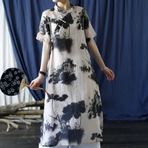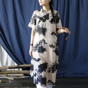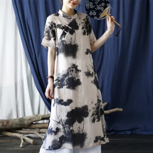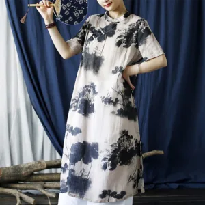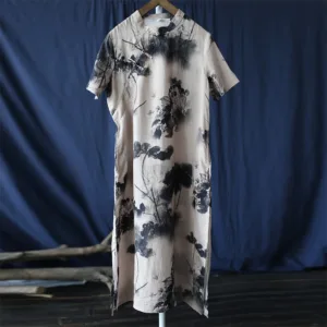 Ramie Linen Ink Lotus Leaf cheongsam merges traditional artistry with contemporary comfort. This short sleeve dress showcases intricate ink lotus leaf patterns on high-quality ramie linen. The classic cheongsam design provides an elegant and sophisticated look. Ideal for those who appreciate cultural heritage and refined style. this dress is perfect for both special occasions and everyday wear.