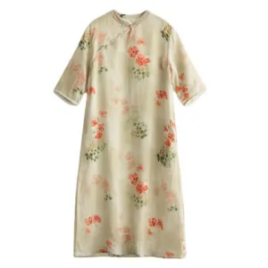 Red Flower Green Leaves dress features a vibrant floral print on a classic Chinese Cheongsam design. Made from comfortable fabric. this half sleeve midi dress provides ease of movement and practicality with its pockets. The combination of traditional elegance and modern functionality makes it perfect for various occasions. embodying natural beauty and cultural heritage.