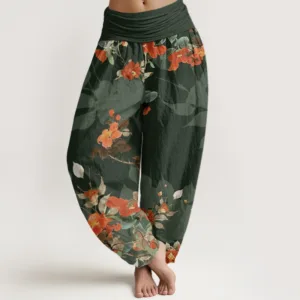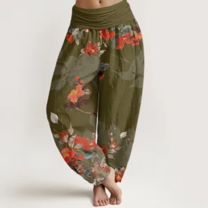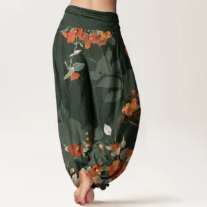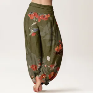 - Design: The design of these pants features an intricate pattern of red flowers. with delicate petals and flowing shapes that create a dynamic and elegant look. The floral motif adds a touch of natural beauty. making the pants both stylish and visually striking.