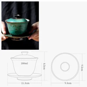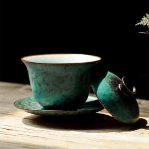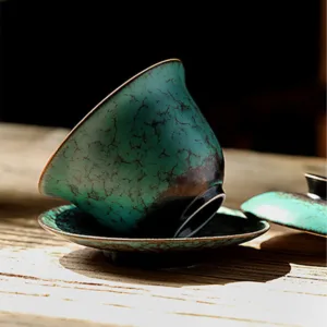 Retro Green Glaze Ceramic Gaiwan Sancai Teacup Kung Fu Tea Cup And Saucer With Lid