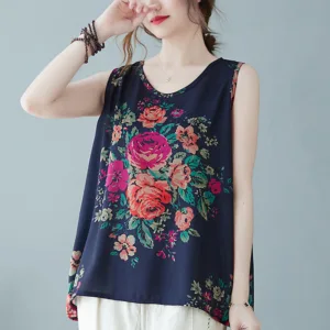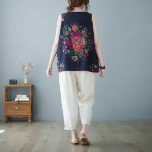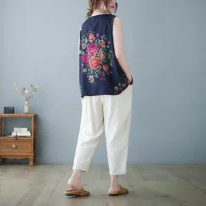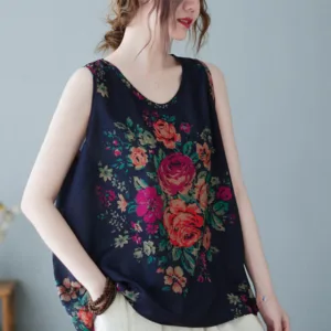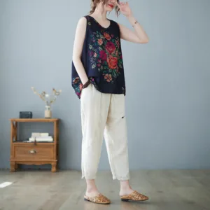 Retro Peony Flowers tank top features a loose-fitting design with a round neck and a black background. adorned with blooming peonies at the center. The peony. known as the king of flowers. symbolizes wealth. honor. and beauty. This outfit embodies the elegance and richness of traditional culture. serving as a reminder of the timeless beauty and prosperity that peonies represent.