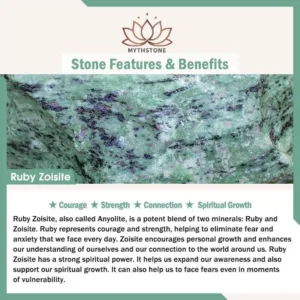 Ruby Zoisite. also called Anyolite. is a potent blend of two minerals: Ruby and Zoisite. Ruby represents courage and strength. helping to eliminate fear and anxiety that we face every day. Zoisite encourages personal growth and enhances our understanding of ourselves and our connection to the world around us. Ruby Zoisite has a strong spiritual power. It helps us expand our awareness and also support our spiritual growth. It can also help us to face fears even in moments of vulnerability.