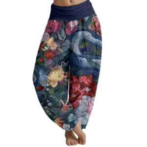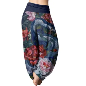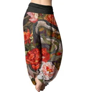 - Design: The harem pants feature snake peony flowers and leaf patterns. Snakes are often seen as symbols of wisdom. spirituality and transformation in traditional Chinese culture. representing the cycle and regeneration of life. Peonies symbolize wealth. prosperity and beauty. When snakes are wrapped around the peony. it is a combination of wisdom and beauty. suggesting that in the pursuit of a better life. wisdom and courage are needed to face the challenges in life. These elements make this pair of pants not only fashionable but also full of meaning.