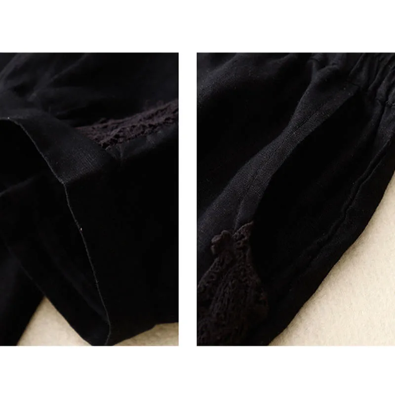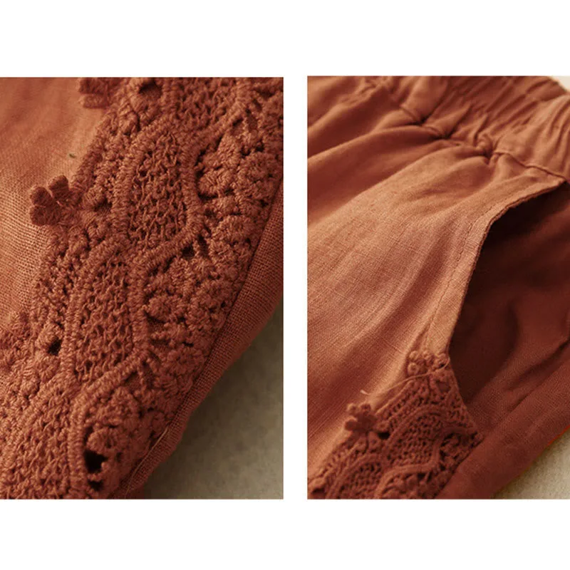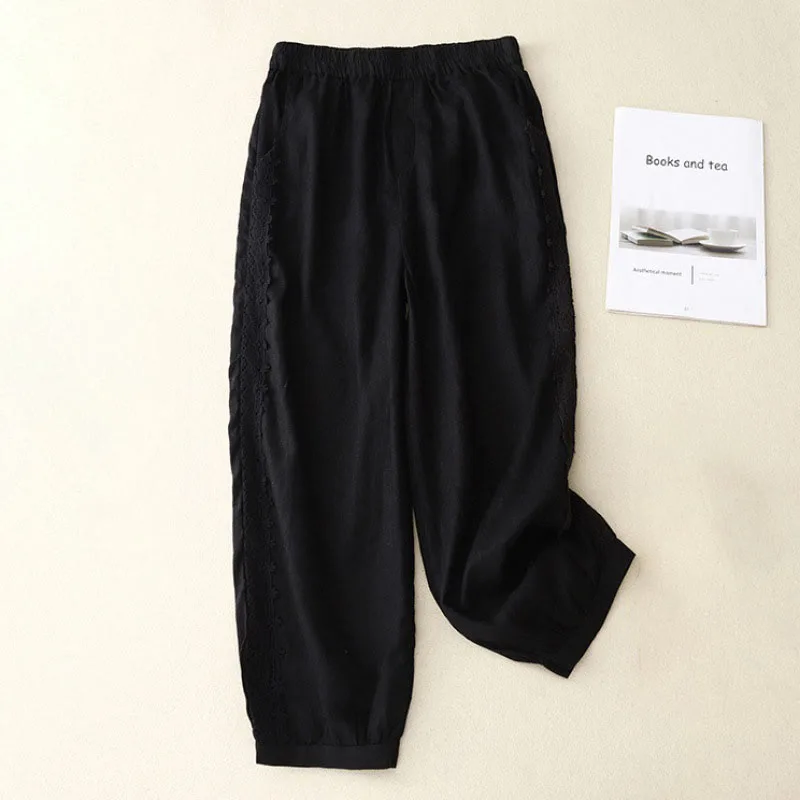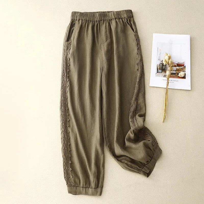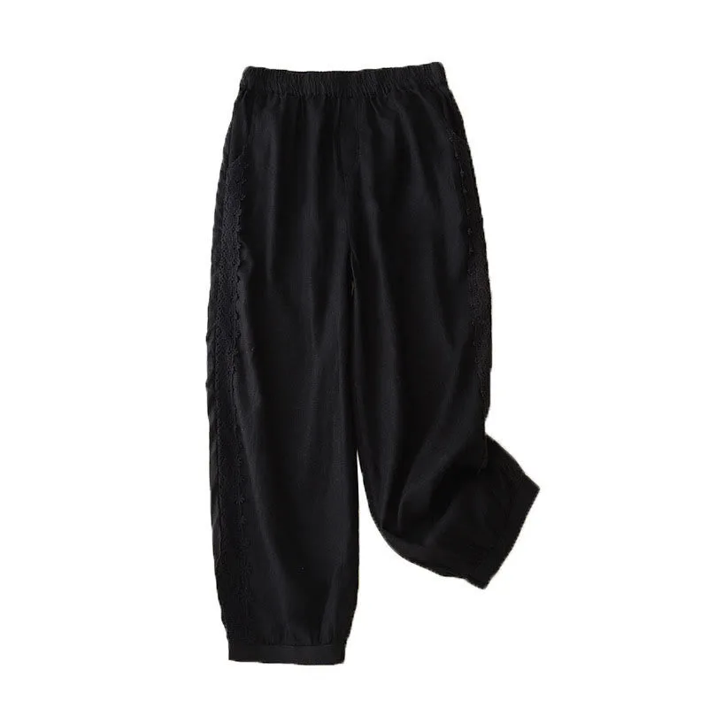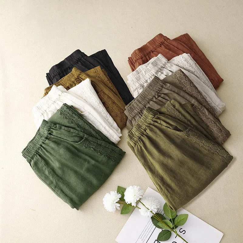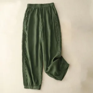 Lace Spliced Harem pants with elastic waist and pockets. offering a relaxed fit for ultimate comfort. These pants symbolize harmony and elegance. ideal for those seeking tranquility and ease in their daily movements. The solid color design with delicate lace and functional pockets make these pants a perfect choice for meditation and mindfulness practices. enhancing your sense of peace.
