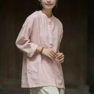 Mythstone Solid Color Long Sleeve Ramie Linen Half Button Women’s Shirt