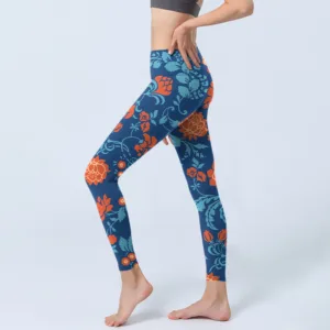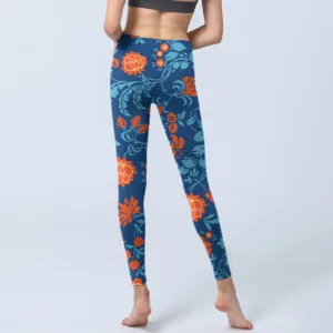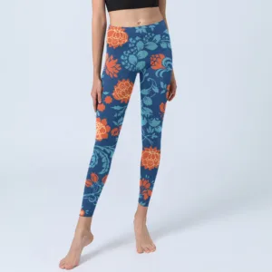 - Design Inspiration: The leggings feature a beautiful floral pattern with vibrant orange and blue flowers. including large blossoms resembling tulips and smaller decorative flowers. The intricate design flows across the fabric. creating a bold yet graceful look. This eye-catching print combines modern style with a touch of nature. making the leggings perfect for both active wear and casual outfits.