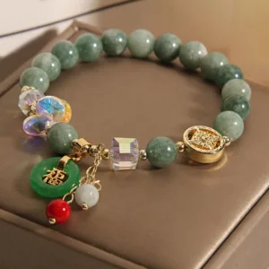 Strawberry Quartz Jade bracelet. adorned with a Fu Character charm. harnesses healing energies and good fortune. This crafted piece combines the love-attracting properties of strawberry quartz with the protective power of jade. making it a potent symbol of well-being and prosperity. Ideal for those seeking to enhance their emotional and spiritual health.