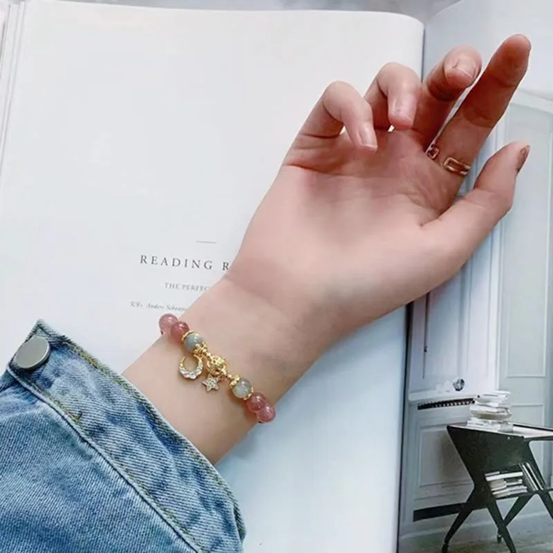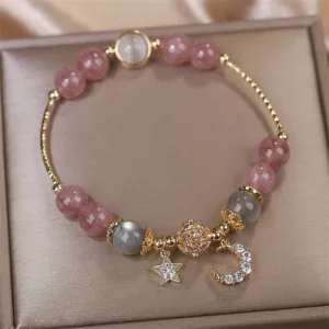 Discover the magic of love and serenity with our Moon Star Love Bracelet. featuring a harmonious blend of Strawberry Quartz and Moonstone adorned with moon and star motifs. This bracelet not only captivates with its beauty but also embodies the essence of love. joy. and emotional healing. Strawberry Quartz infuses the heart with love. while Moonstone nurtures intuition and harmony. creating a talisman for love and a balanced spirit.