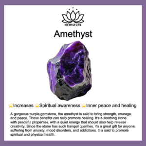 A gorgeous purple gemstone. the amethyst is said to bring strength. courage. and peace. These benefits can help promote healing. Its a soothing stone with peaceful properties. with a quiet energy that should also help release creativity. Since the stone has such tranquil qualities. its a great gift for anyone suffering from anxiety. mood disorders. and addictions. It is said to promote spiritual and physical health.