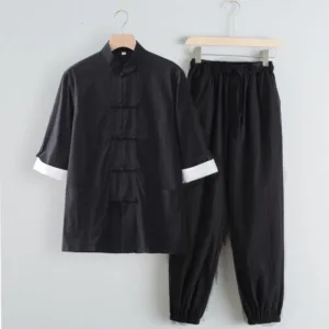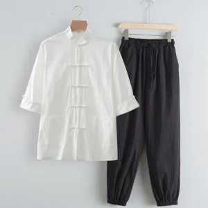 Tang Frog-Button Three Quarter Sleeve Clothes feature a classic design with a unique frog-button closure. offering a blend of tradition and modernity. The top comes in various colors. allowing for personalization. while the black pants provide a versatile and grounding element. Made from breathable materials. these clothes ensure comfort and ease. making them ideal for both casual and formal occasions.