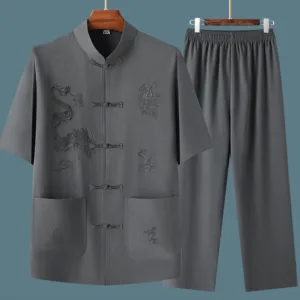 Crafted from high-quality materials. the Mythstone Tang Suit Hanfu Chinese Dragon Traditional Kung Fu Uniform Set offers a blend of comfort and style. The short sleeve tops and pants feature intricate Chinese dragon motifs. combining traditional elegance with modern design for a truly unique men’s clothing ensemble.