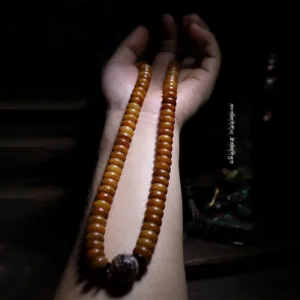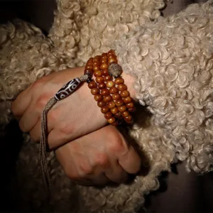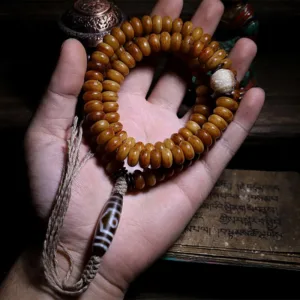 Immerse yourself in the power of protection and positivity with our Mythstone Tibet 108 Mala Beads Yak Bone Three-eyed Dzi Bead Keep Away Evil Spirits Bracelet. Crafted from sacred yak bone and adorned with a Three-eyed Dzi Bead. this bracelet symbolizes balance. strength. luck. and protection. Let its healing properties resonate through you as you navigate life’s journey. Rest assured. the bone jewelry is sourced from yaks that have passed away naturally.