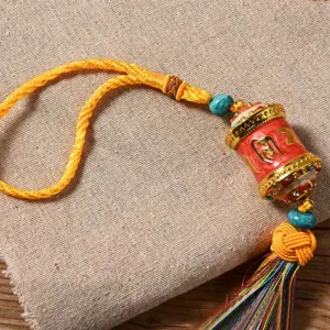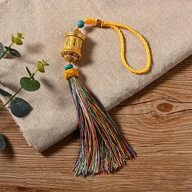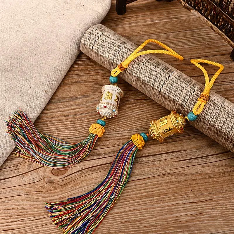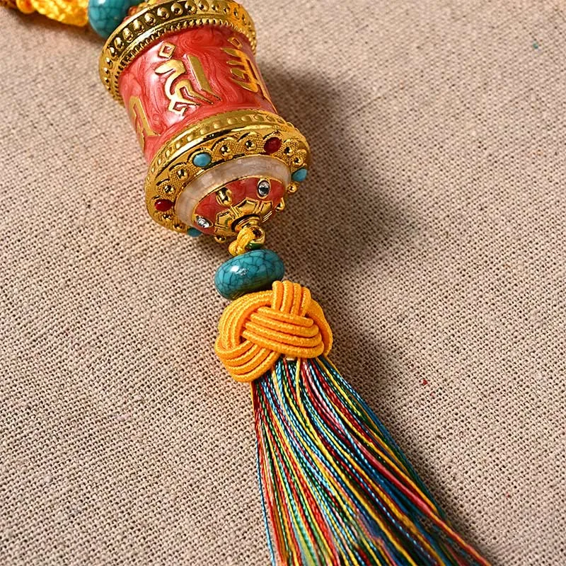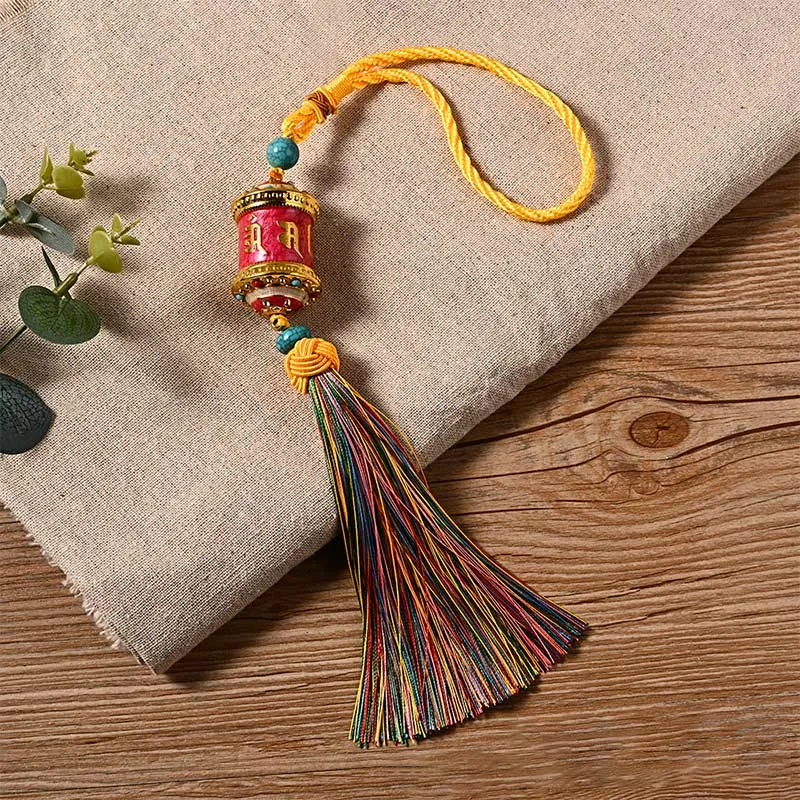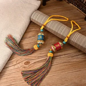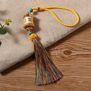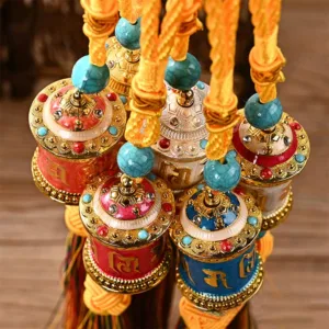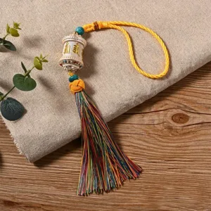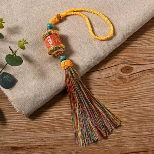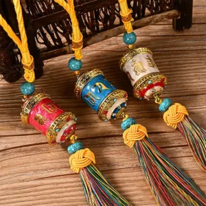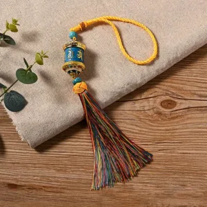 Elevate your car interior with the Mythstone Tibet Om Mani Padme Hum Prayer Wheel Car Hanging. This colorful tassel decoration carries the Six True Words mantra ‘Om Mani Padme Hum.’ symbolizing love. wisdom. and purity. Let the vibrations of this powerful mantra create a sense of peace. focus. and creativity during your journeys.