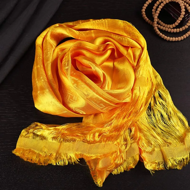Our Mythstone Tibetan Blessing Auspicious 5 Colors Jacquard Khata Decoration is a traditional ceremonial scarf that symbolizes purity and compassion. Made of high-quality silk. it’s perfect for ceremonial occasions like weddings. funerals. graduations. and more.