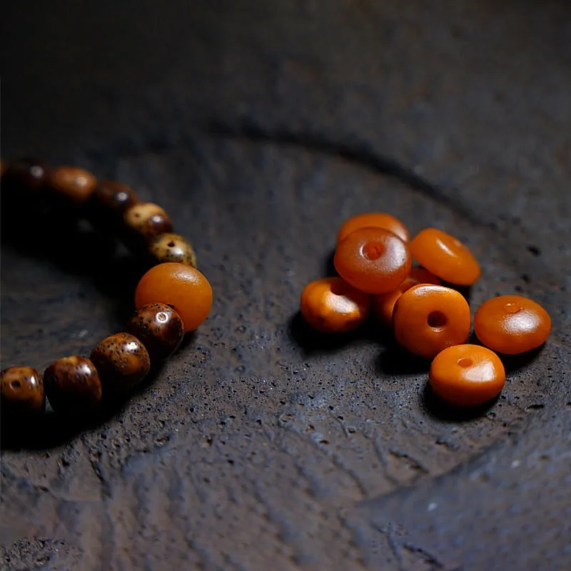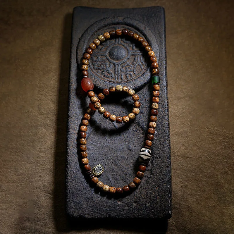 - Material: Bodhi Seed. Amber. Coconut Shell. Coloured Glaze/Liuli Glass. Dzi Bead. Agate. Copper/Brass