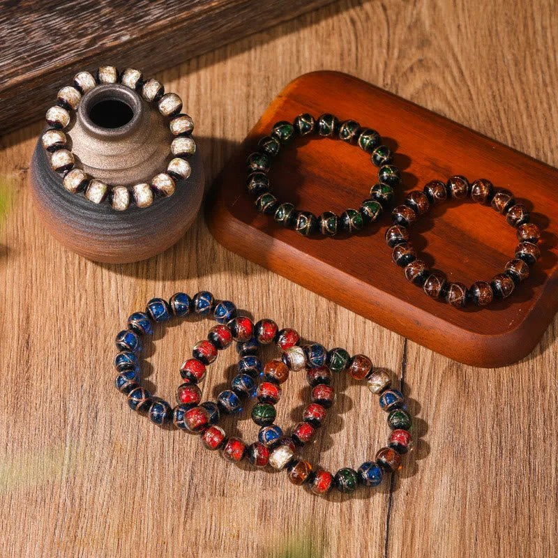 Find peace and protection with our Tibetan bracelet. featuring incense ash porcelain. fluorescent liuli beads. and a copper coin charm for balance and well-being.