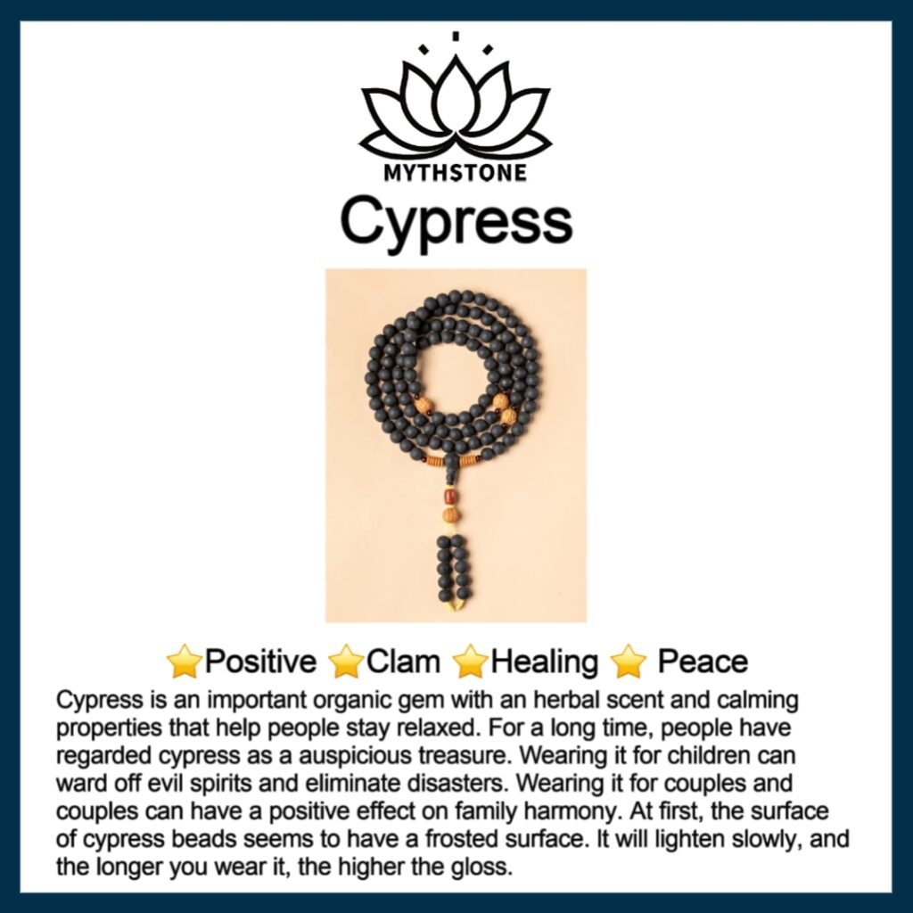 Cypress is an important organic gem with an herbal scent and calming properties that help people stay relaxed. For a long time. people have regarded cypress as a auspicious treasure. Wearing it for children can ward off evil spirits and eliminate disasters. Wearing it for couples and couples can have a positive effect on family harmony. At first. the surface of cypress beads seems to have a frosted surface. It will lighten slowly. and the longer you wear it. the higher the gloss.