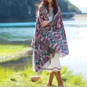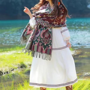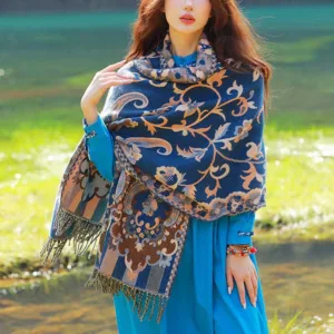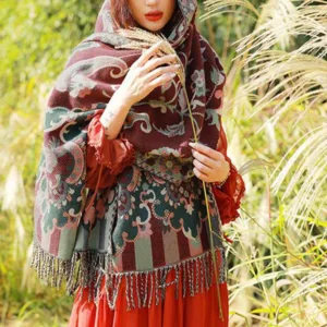 Elevate your winter style with our Mythstone Tibetan Vine Leaves Shawl. Crafted for cozy comfort during your travels. this versatile scarf doubles as a wrap. The intricate vine leaves pattern adds an elegant touch. making it a statement piece for any outfit. Embrace warmth and style as you wrap yourself in this shawl. making it an essential accessory for chilly adventures.