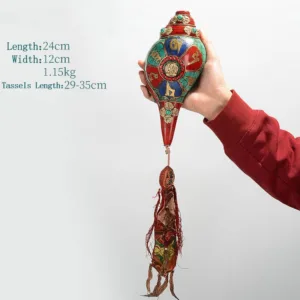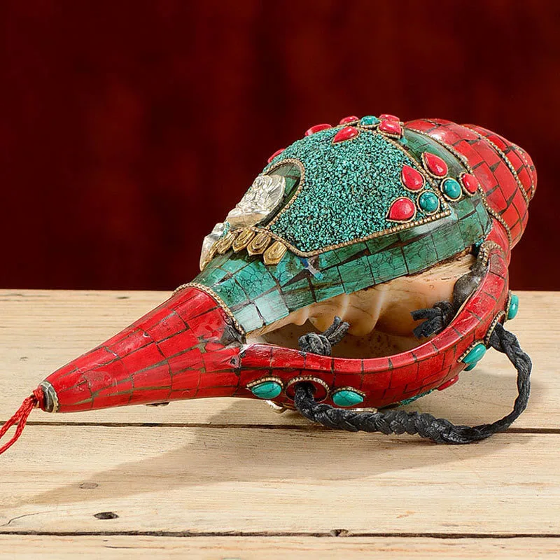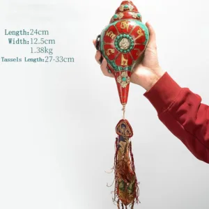 Handcrafted with dedication. this Tibetan Shankha from Mythstone is a masterpiece. Engraved with the sacred “Om Mani Padme Hum” and the compassionate Avalokitesvara. set against vibrant turquoise. it stands as a beacon of positivity. Let its divine energy infuse your space with warmth. serenity. and an ever-present touch of spiritual elegance. A must-have for seekers of beauty and depth.