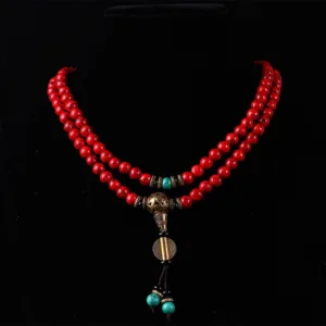 The Tibetan Mala Red Turquoise Lucky Necklace Bracelet is a beautiful and versatile piece of jewelry that can be worn both as a necklace and a bracelet. Crafted primarily from red turquoise beads. it also features several turquoise stones. The necklace is long. making it perfect for layering or wearing on its own. Ideal for those seeking balance during meditation. this mala is a powerful tool for spiritual practice.