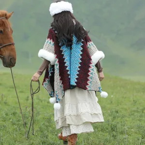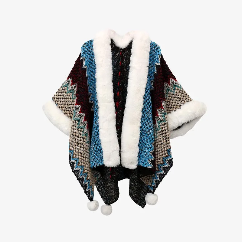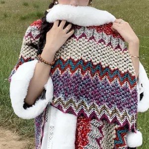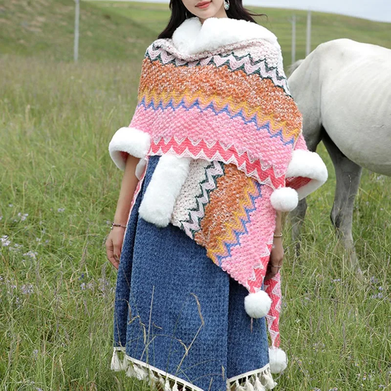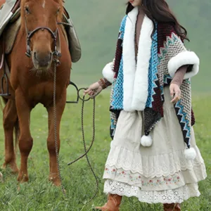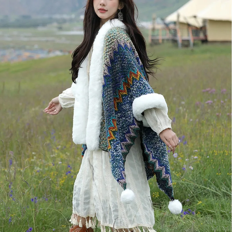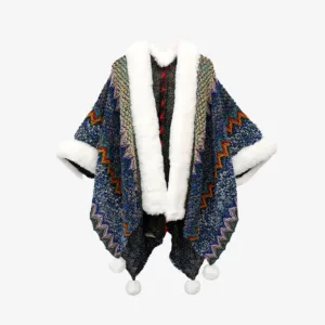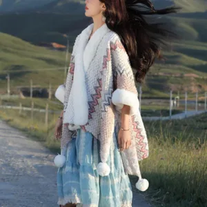 Mythstone Wavy Shawl coat. featuring a distinctive multicolored wavy lines pattern. perfectly captures the dynamic beauty of Tibetan landscapes. Expertly knitted for maximum warmth and unparalleled comfort. it serves as an ideal companion for chilly winter travels or for adding a touch of cozy elegance to any evening at home. The wavy design not only adds a vibrant aesthetic but also symbolizes life’s ever-changing and flowing nature.