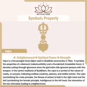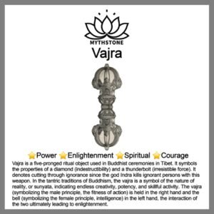 Vajra is a five-pronged ritual object used in Buddhist ceremonies in Tibet. It symbols the properties of a diamond (indestructibility) and a thunderbolt (irresistible force). As a symbol for the properties of a diamond. vajra signifies indestructibility as diamonds are the hardest of stones. As a symbol for the thunderbolt. vajra represents the irresistible force. It denotes cutting through ignorance since the god Indra kills ignorant persons with this weapon.