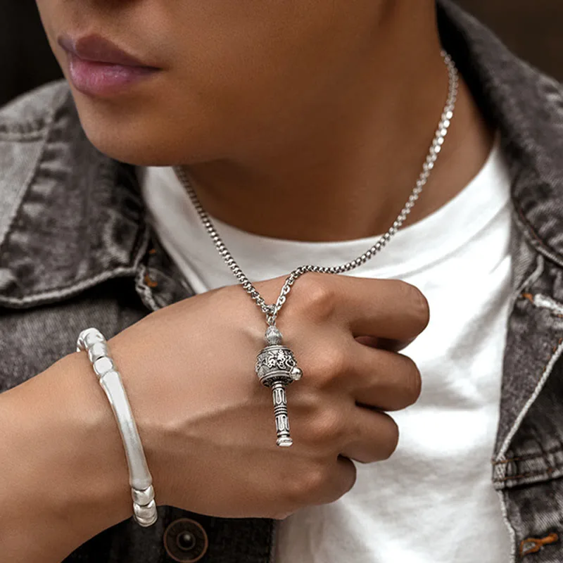 This Tibetan Om Mani Padme Hum Prayer Wheel Necklace Pendant features the six true words mantra. symbolizing love. wisdom. peace. and creativity. Made of high-quality materials and crafted by skilled artisans. it’s a meaningful and unique accessory that brings positive change.