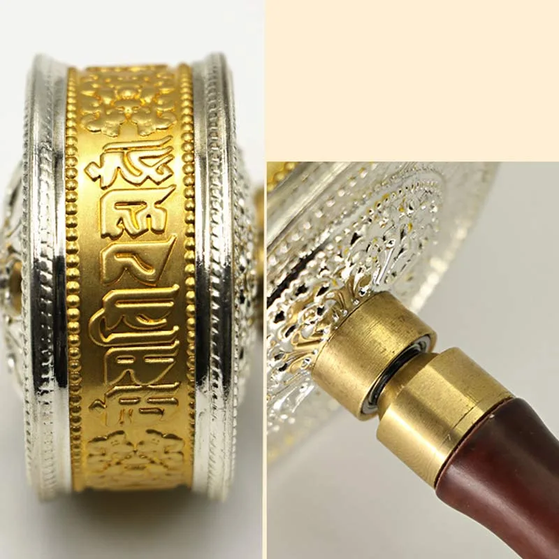 - Traditionally. a mantra is written in Tibetan language. on the outside of the wheel. The mantra Om mani padme hum is most commonly used. but other mantras may be used as well.