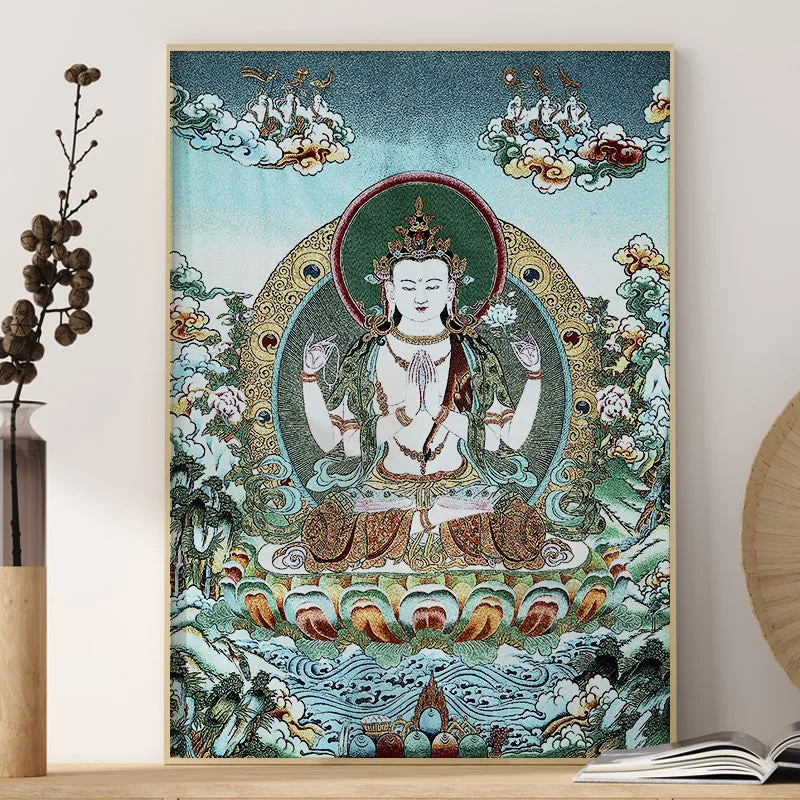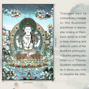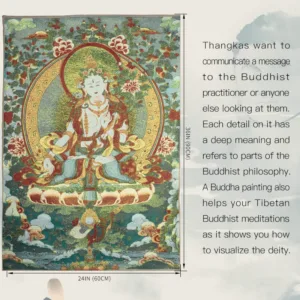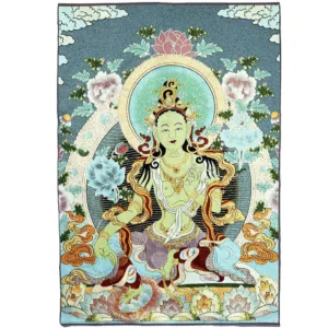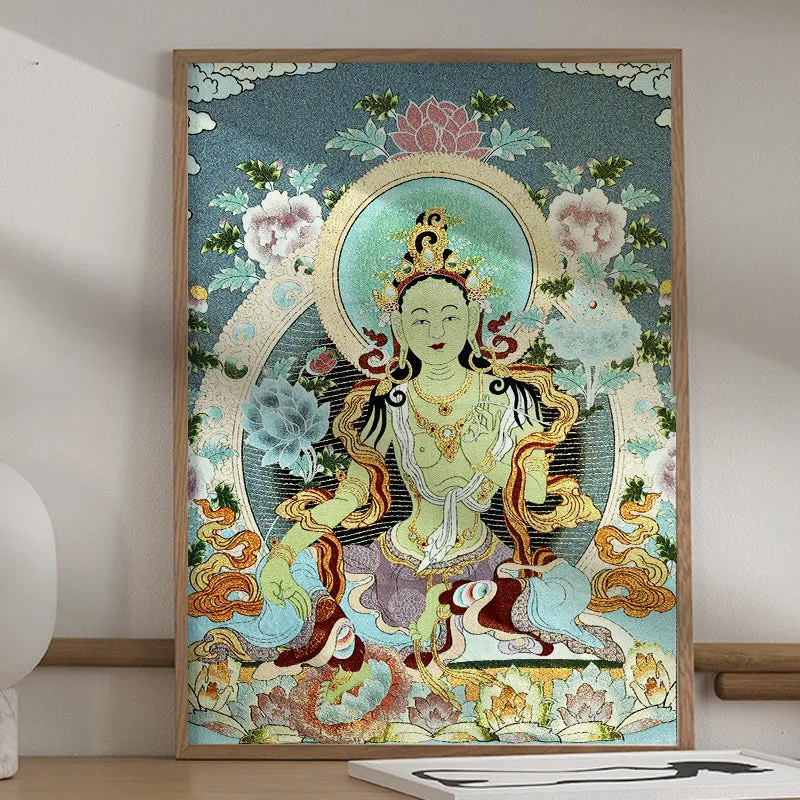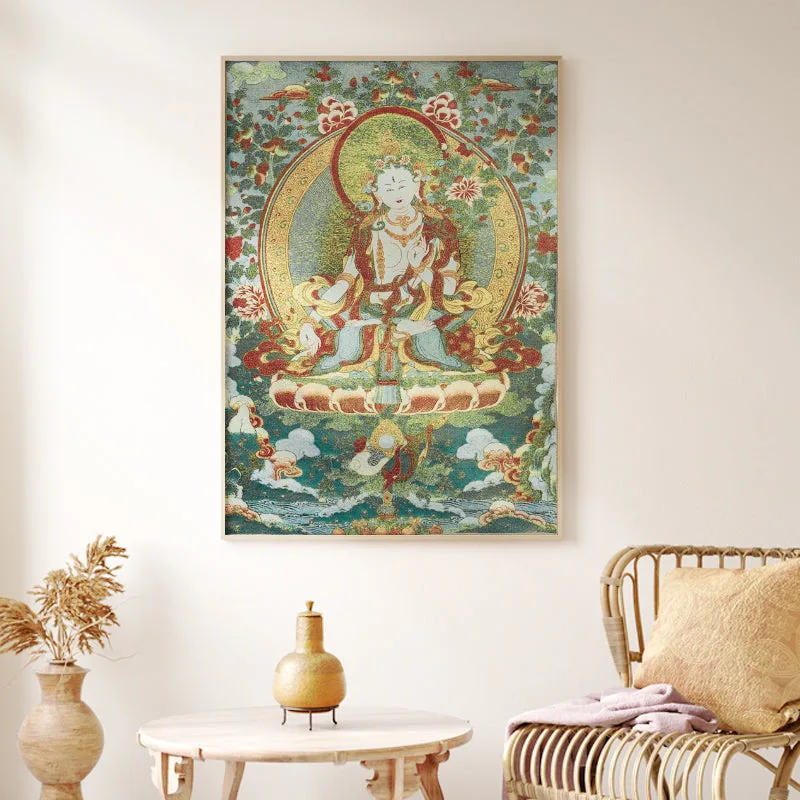 This exquisite Tibetan Silk Embroidery White Tara Thangka Tapestry is a perfect embodiment of graceful power. wisdom. and purity. It’s the perfect wall decoration for living rooms. bedrooms. and offices. Made of high-quality silk. this product is 100% handmade and presents exquisite and detailed embroidery. It’s not printed. and it’s a meaningful gift for yourself or your loved ones.