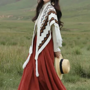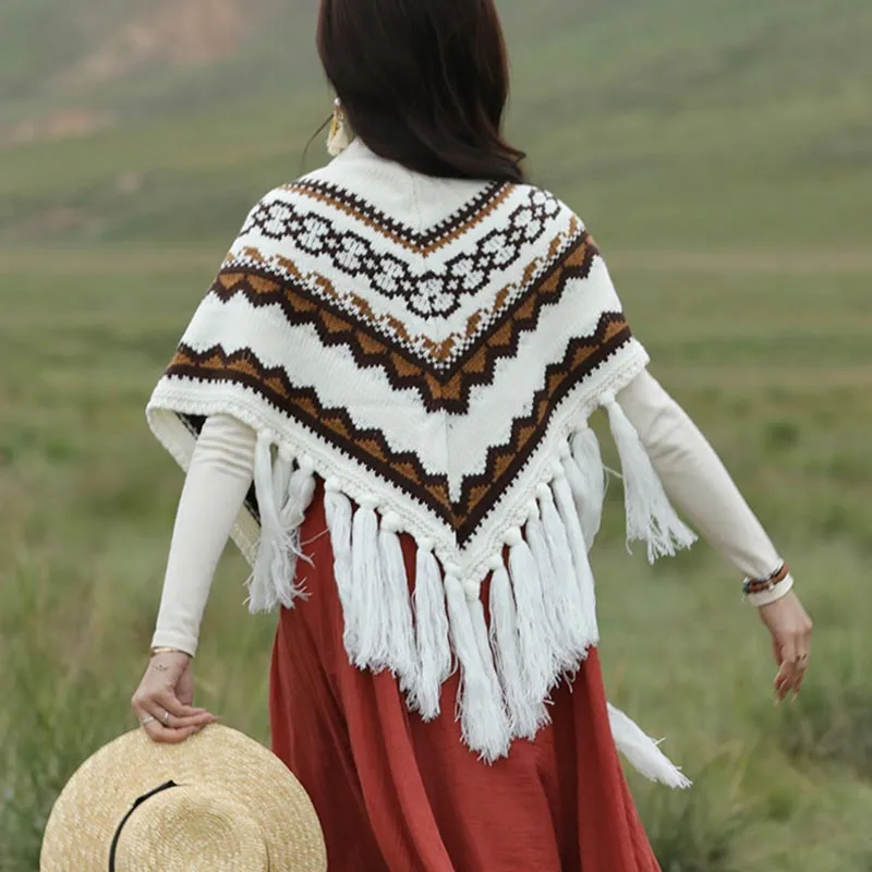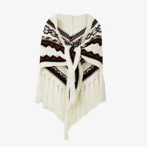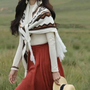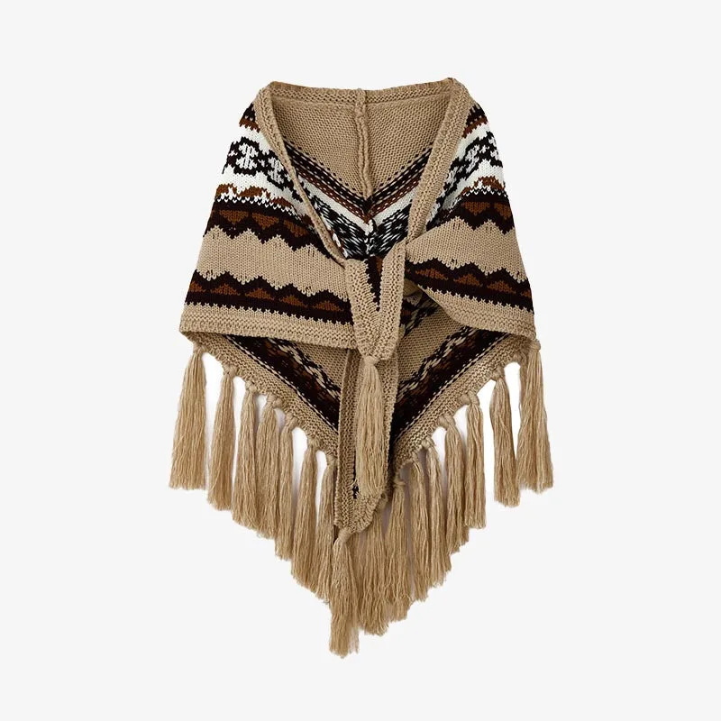 Mythstone Triangular shawl. with its striped pattern and tassels. is the epitome of cozy elegance. Perfect for travel. its design symbolizes journey and adventure. Crafted for warmth and comfort. it’s an ideal accessory to wrap yourself in. whether exploring new places or enjoying a quiet moment at home.