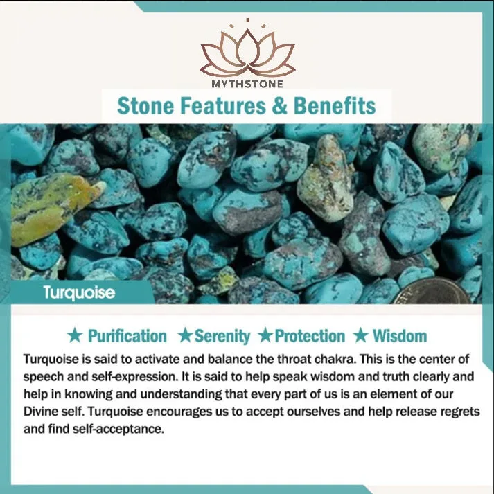 Turquoise is said to activate and balance the throat chakra. This is the center of speech and self-expression. It is said to help speak wisdom and truth clearly and help in knowing and understanding that every part of us is an element of our Divine self. Turquoise encourages us to accept ourselves and help release regrets and find self-acceptance.