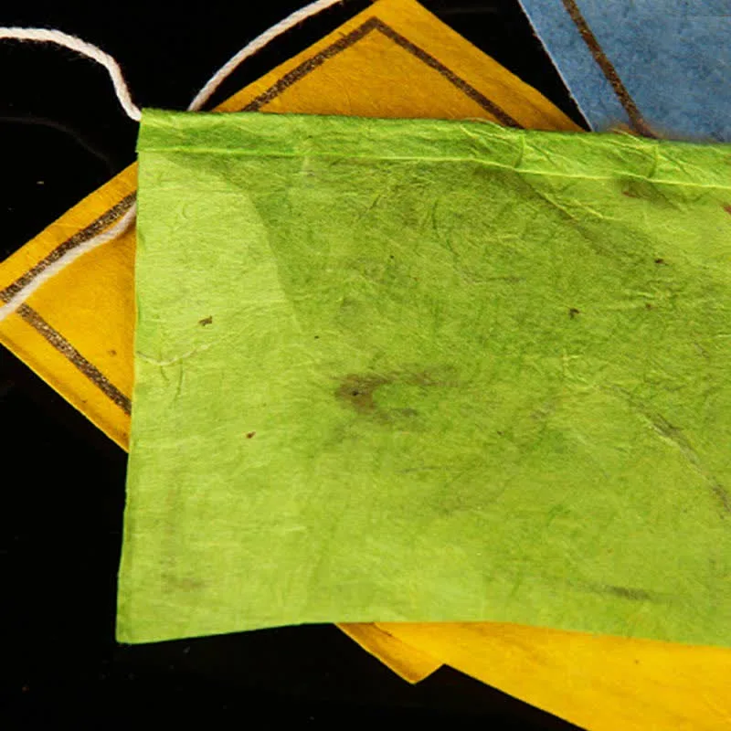 - Hand printed in the traditional manner from wooden blocks in Kathmandu. Nepal by Tibetan artisans. The flags are the traditional colors of yellow. white. red. blue. and green. Prayer Flags are arranged from left to right in a specific order. The color symbolizes Five Elements (Pancha Mahabhuta). Blue – Sky/Space. White – Air/Wind. Red – Fire. Green – Water. Yellow – Earth.