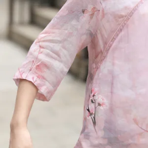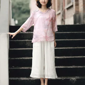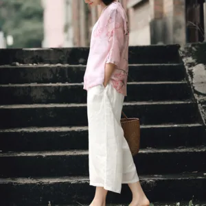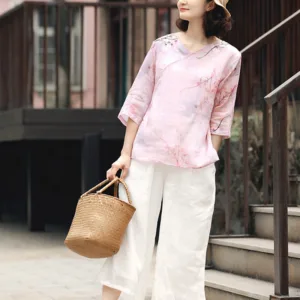 V-Neck Pink Flower blouse features a delicate ramie linen fabric with a serene pink flower pattern. This three-quarter sleeve shirt is designed to promote tranquility and mindfulness. The lightweight and breathable material ensures comfort during meditation or relaxation. Embrace the natural essence of this blouse. perfect for those seeking inner peace and harmony in their spiritual practices.