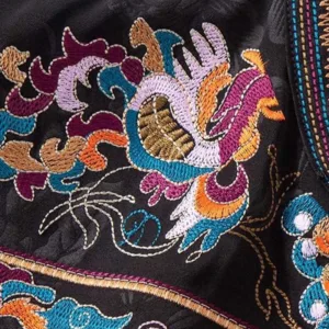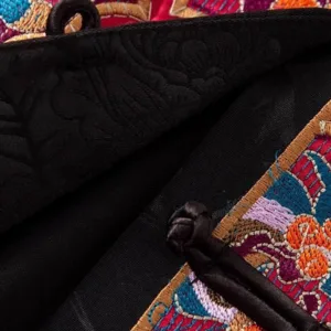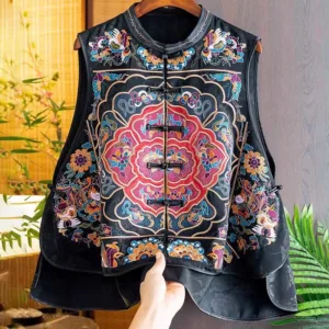 Embroidery Colorful Cloud Flower Vest features symmetrical embroidery of vibrant clouds and flowers. symbolizing harmony and natural beauty. Crafted with intricate detail. this vest brings a balanced design that fosters tranquility and cultural richness. Each embroidered element is thoughtfully arranged. connecting the wearer to nature and tradition. making it a meaningful piece for those who appreciate peace and mindfulness in their daily lives.
