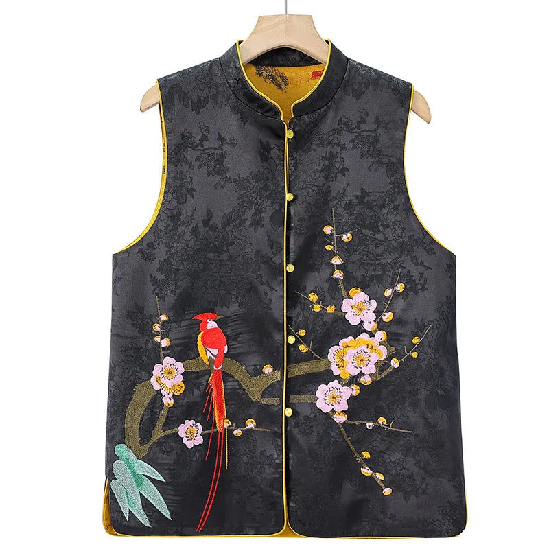 Vintage Embroidery Double-Sided Vest with intricate embroidery showcases a black side adorned with a plum blossom and bird pattern. symbolizing resilience and beauty. The reverse features a gold background with traditional Chinese artwork. adding a vibrant. cultural touch. Crafted for versatility and elegance. this reversible vest allows you to embrace two unique styles in one. blending meaningful design with traditional artistry.