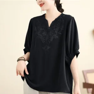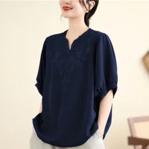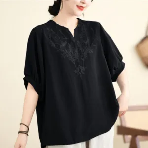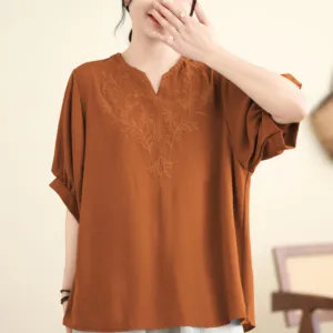 Vintage Embroidery Cotton T-shirt Tee features intricate V-shaped embroidery of flowers and leaves. Crafted from a comfortable blend of cotton and linen. it showcases detailed stitching that adds depth and texture. The V-shaped pattern not only enhances its visual appeal but also symbolizes harmony and growth. Ideal for those who appreciate detailed craftsmanship and meaningful design.