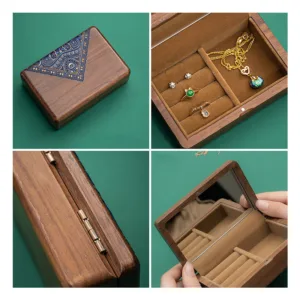 Elevate your jewelry organization with our exquisite Mythstone Vintage Handmade Black Walnut Wood Jewelry Storage Box. Crafted with care. this box exudes timeless elegance. Its black walnut wood exterior showcases rich grains. while the interior provides ample space for your treasures. The built-in mirror adds a touch of practicality and charm. Discover the perfect balance of style and functionality.