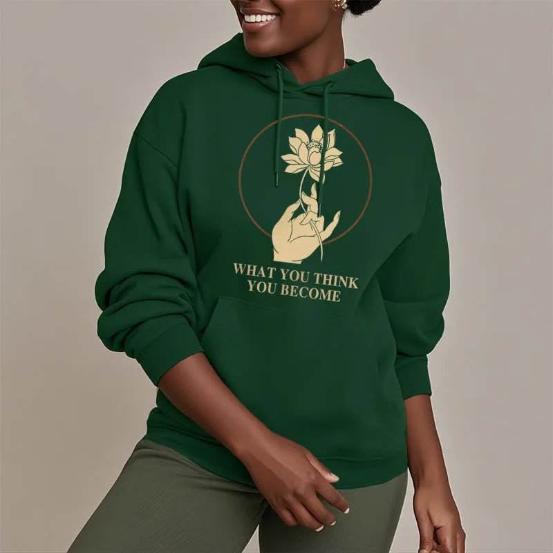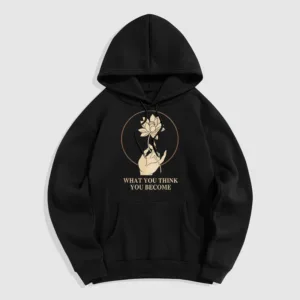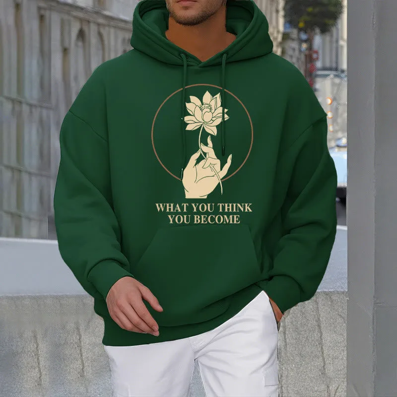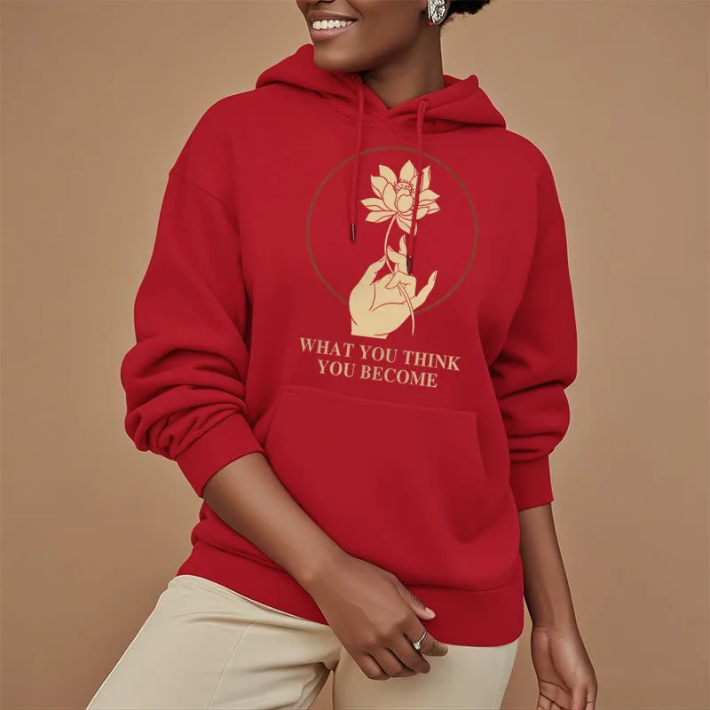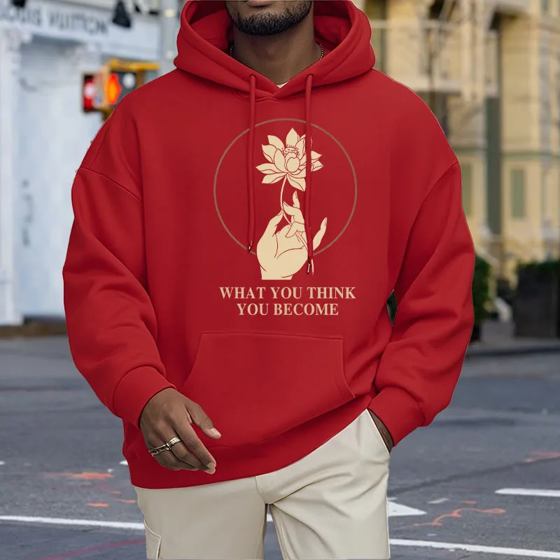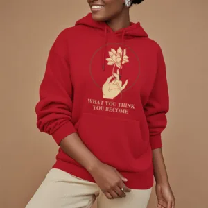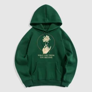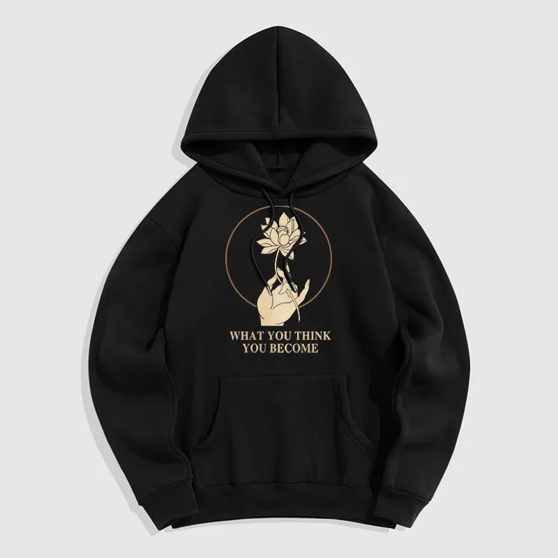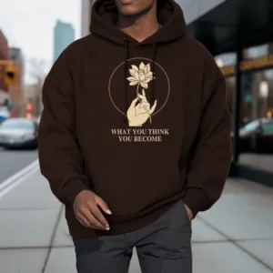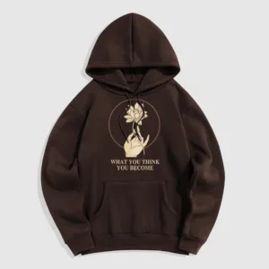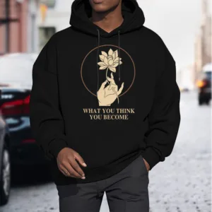 • DESIGN INSPIRATION: This hoodie featuring ahand holding a lotus flower and the phrase “What you think you become”symbolizes the transformative power of thoughts and beliefs. The lotus flower represents purity and spiritual awakening. while the phrase emphasizes that one’s mindset shapes their reality. encouraging wearers to cultivate positive thinking and embrace their potential for growth.