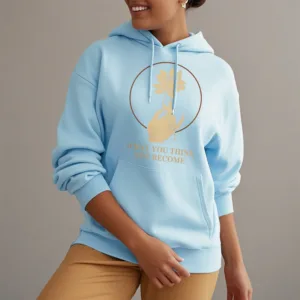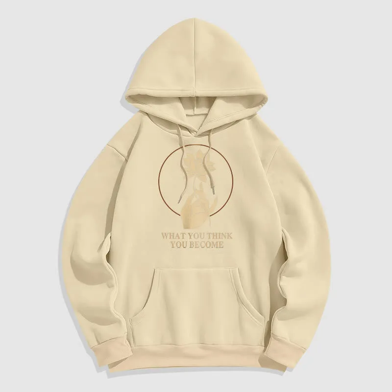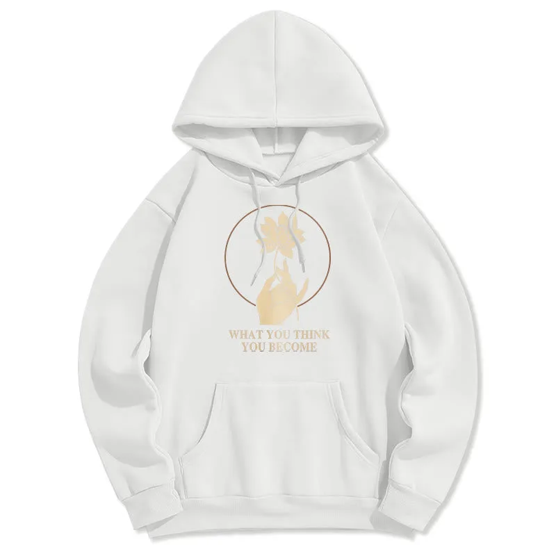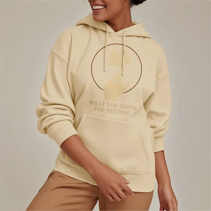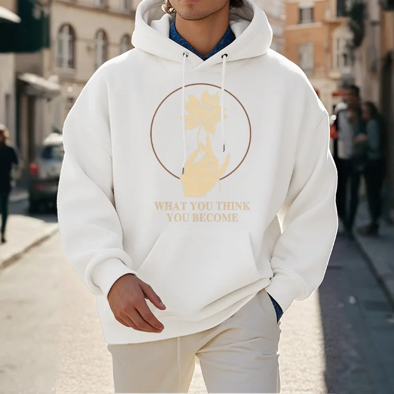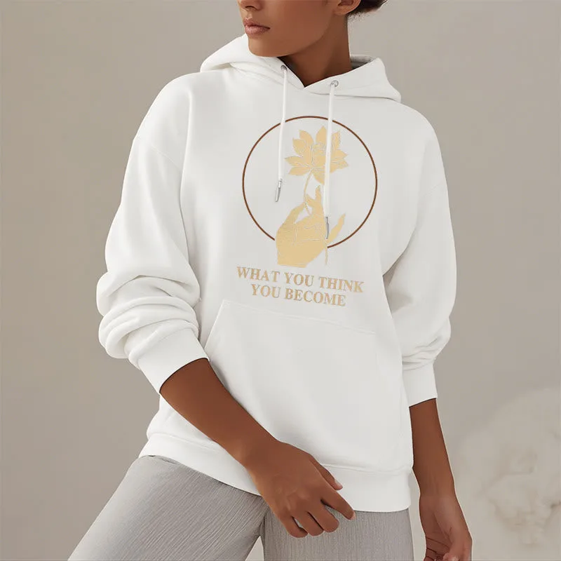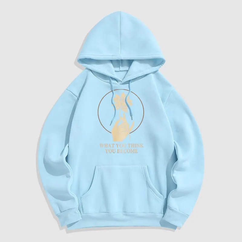 • DESIGN INSPIRATION: This hoodie featuring ahand holding a lotus flower and the phrase “What you think you become”symbolizes the transformative power of thoughts and beliefs. The lotus flower represents purity and spiritual awakening. while the phrase emphasizes that one’s mindset shapes their reality. encouraging wearers to cultivate positive thinking and embrace their potential for growth.