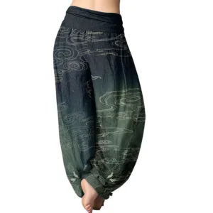 - Design: The harem pants featuring designs of white Auspicious clouds. trees. birds. and the moon symbolize serenity. freedom. and the beauty of nature. The white Auspicious clouds represent peace and tranquility. while the trees signify growth and stability; the birds evoke a sense of liberation and aspiration. and the moon adds a mystical element. together encouraging wearers to connect with nature and embrace a harmonious lifestyle.