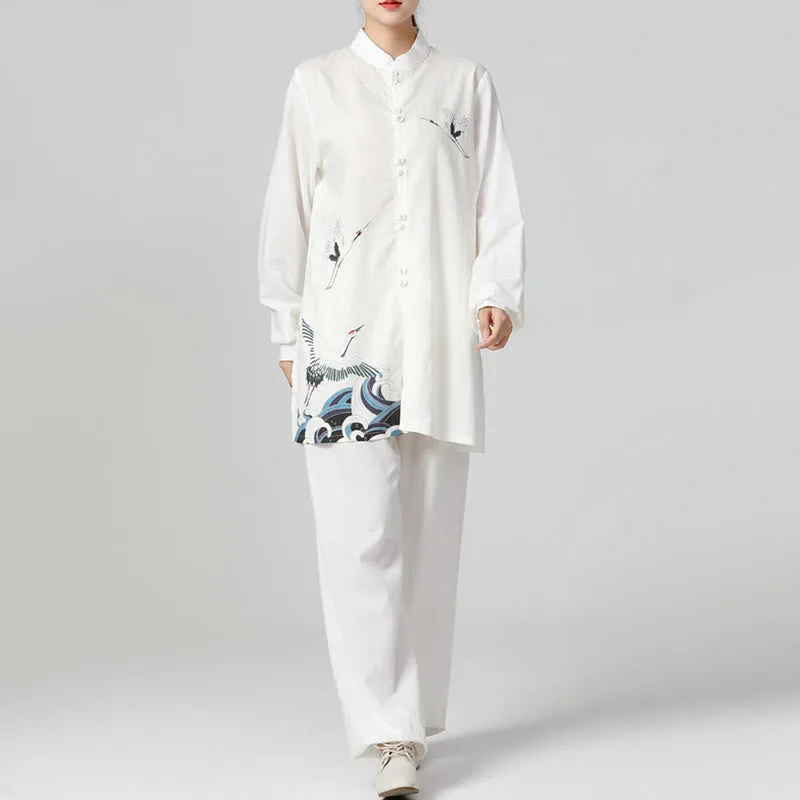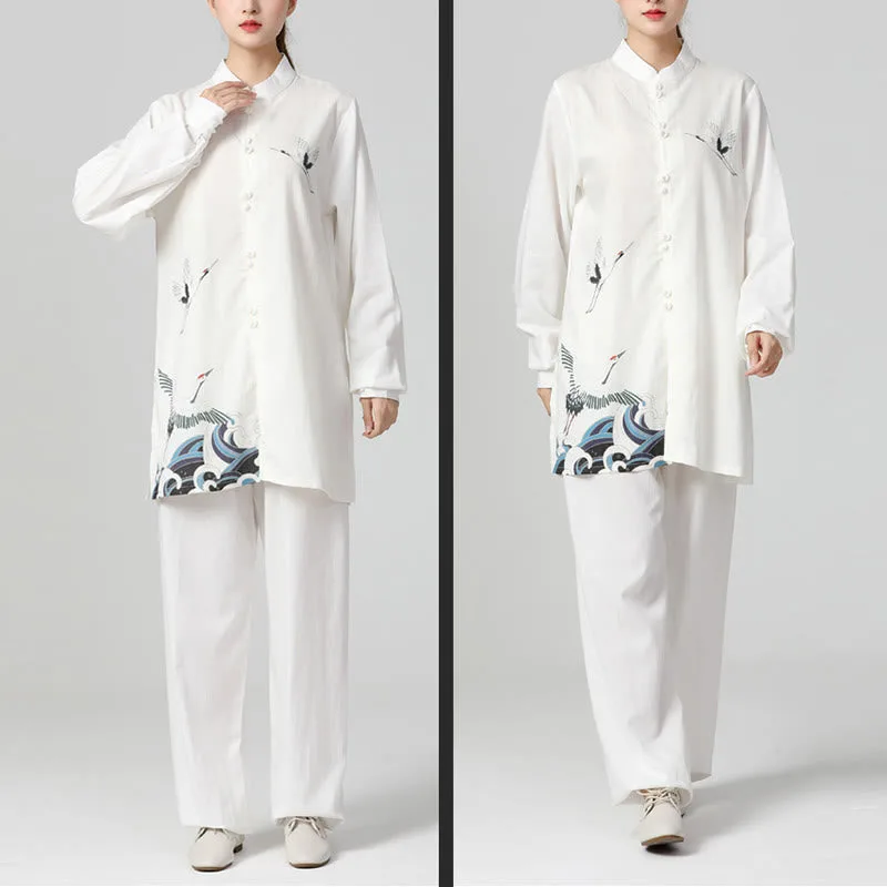 Mythstone White Crane Sea Cotton Linen Meditation Prayer Spiritual Zen Tai Chi Qigong Practice Clothing Set
