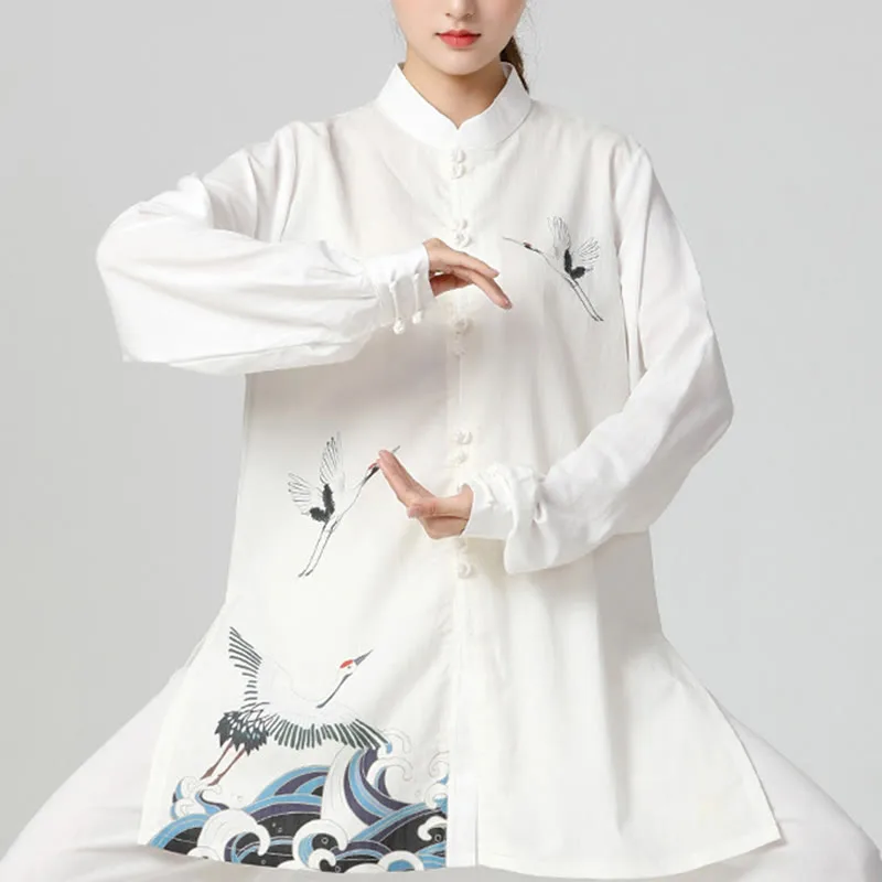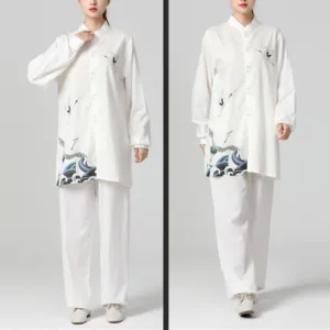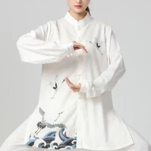 White Crane Sea Clothing set is designed for meditation. prayer. and spiritual practices. Made from a breathable cotton-linen blend. this set includes a top and pants featuring white crane and sea motifs. Ideal for Tai Chi and Qigong. it promotes comfort and mindfulness. helping you achieve a peaceful state during your practice.
