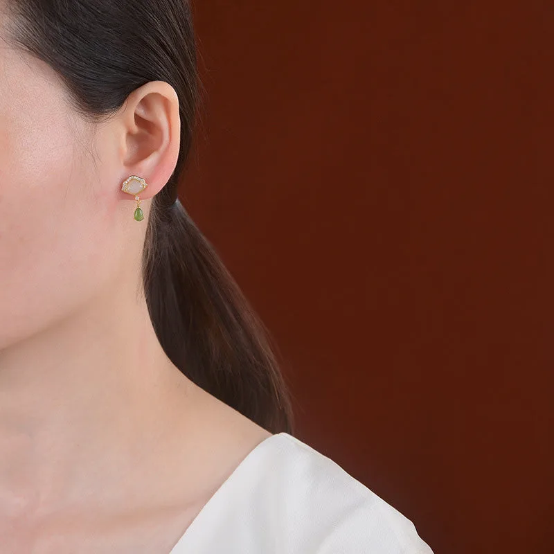 Mythstone White Jade Cyan Jade Fan Water Drop Pattern Luck Drop Earrings