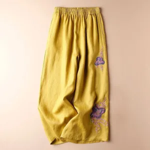 Women’s Loose Cotton Linen pants with embroidery and wide legs. offering a relaxed fit for ultimate comfort. These pants symbolize simplicity and natural beauty. ideal for those seeking tranquility and ease in their daily movements. The delicate embroidery and functional pockets make these pants a perfect choice for meditation and mindfulness practices. adding a touch of elegance to your routine.