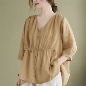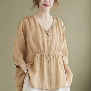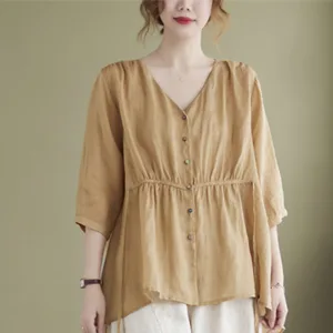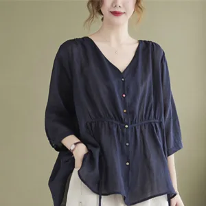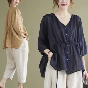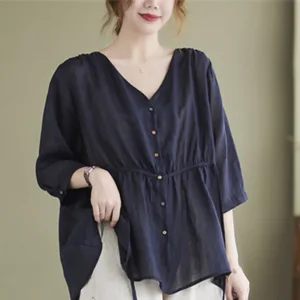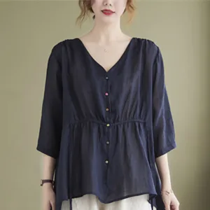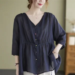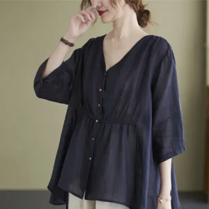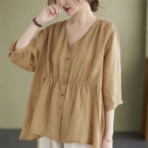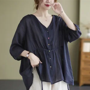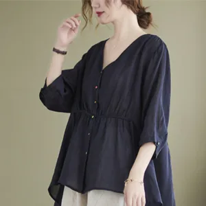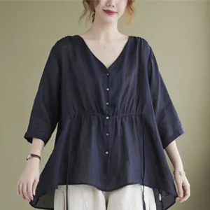 Button Down Half Sleeve Cotton shirt features a V-neck and a cinched waist that creates a flattering silhouette. Crafted from a blend of quality fabrics. this shirt combines comfort with an elegant design. The button-down front allows for adjustable fit. making it versatile for various occasions while providing a touch of refined sophistication.