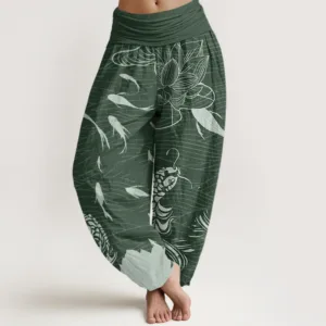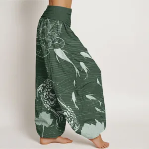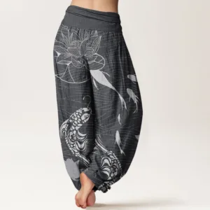 Design: The design of these harem pants beautifully blends koi fish and lotus flowers. The koi swim gracefully amidst soft. flowing lines. while the lotus flowers are intricately detailed. adding a serene. natural touch. The overall pattern evokes a peaceful aquatic scene. combining elements of water. flora. and fluid movement.