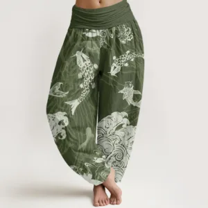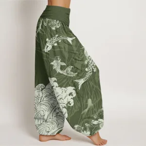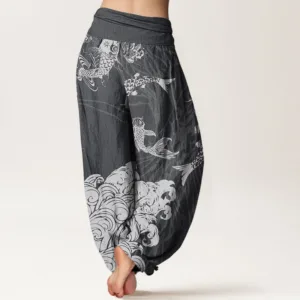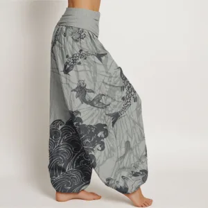 Design: These harem pants feature a detailed design of koi fish swimming through flowing waves. The fish are intricately depicted with delicate scales and graceful movements. while the waves elegantly curve around them. This creates a harmonious and dynamic scene. beautifully blending nature and water.