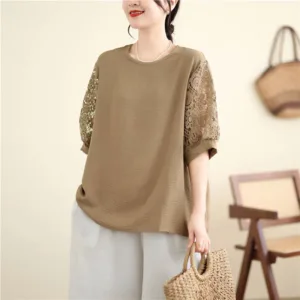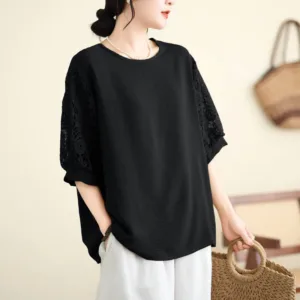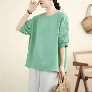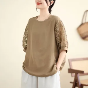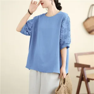 Lace Sleeve Crew Neck T-shirt Tee features delicate. hollowed-out lace sleeves that add a touch of elegance to the classic crew neck. Made from a soft cotton-linen blend. this tee offers both comfort and breathability. The intricate lace detailing provides a refined look while ensuring a comfortable fit. making it a versatile choice for various occasions.